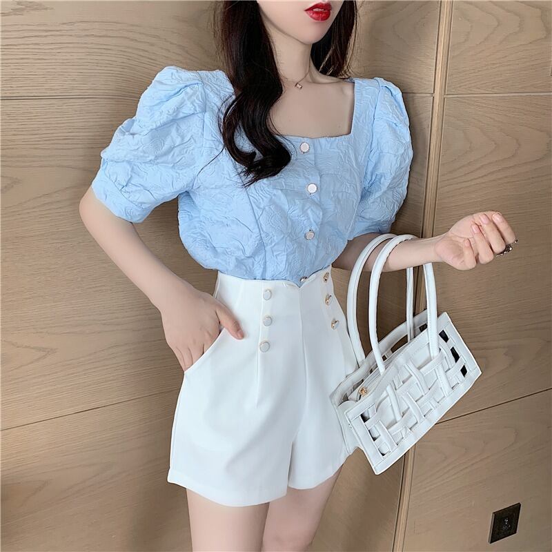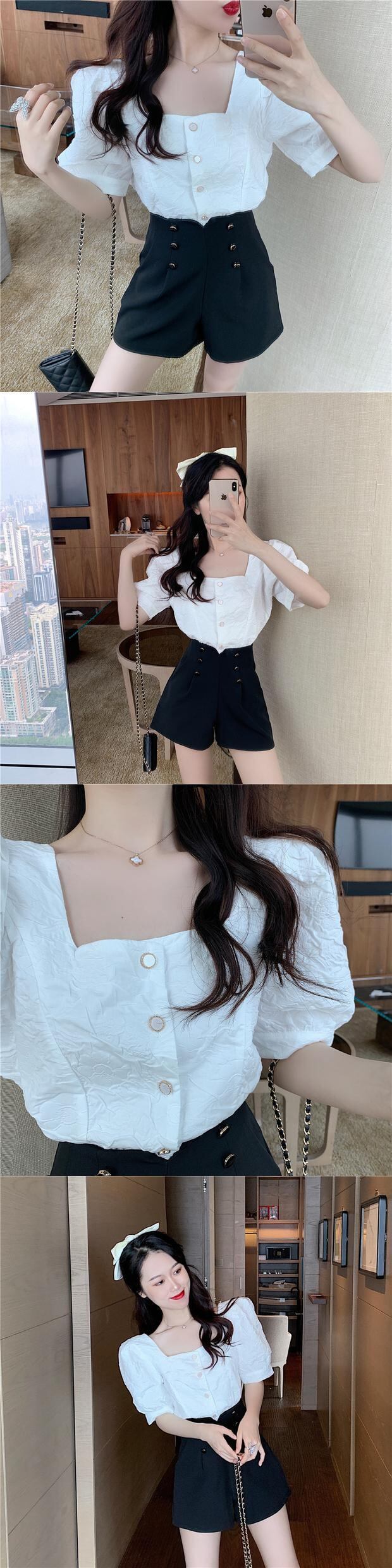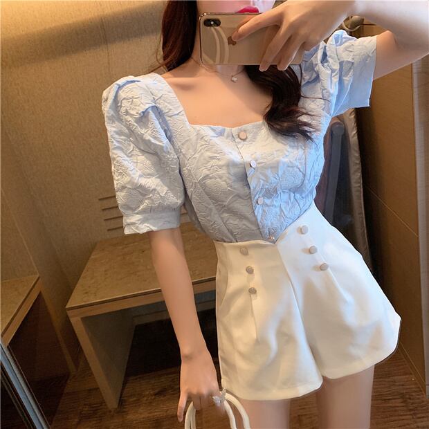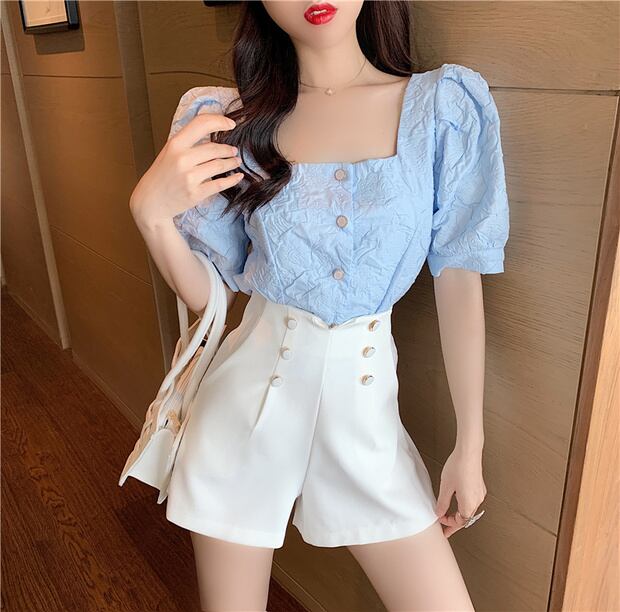 色:ホワイトトップ,ライトブルーのトップ,ホワイトショーツ,黒のショートパンツ