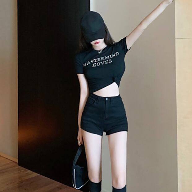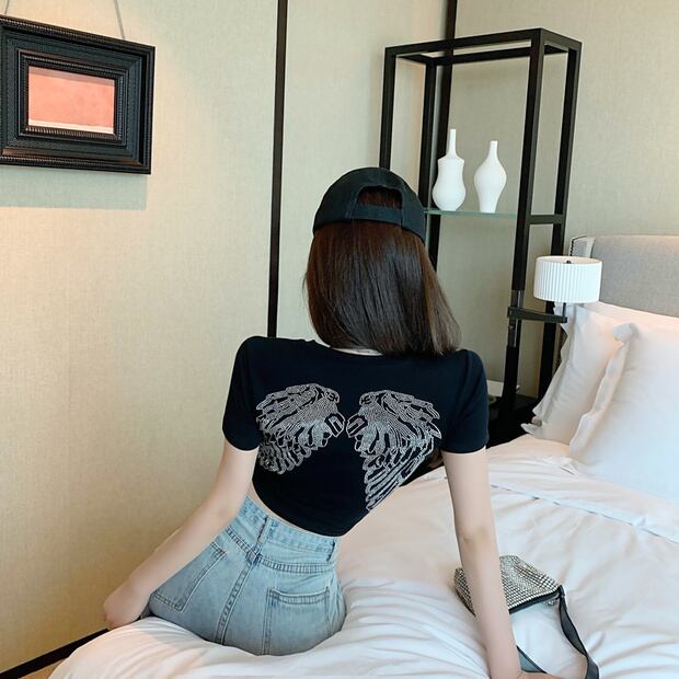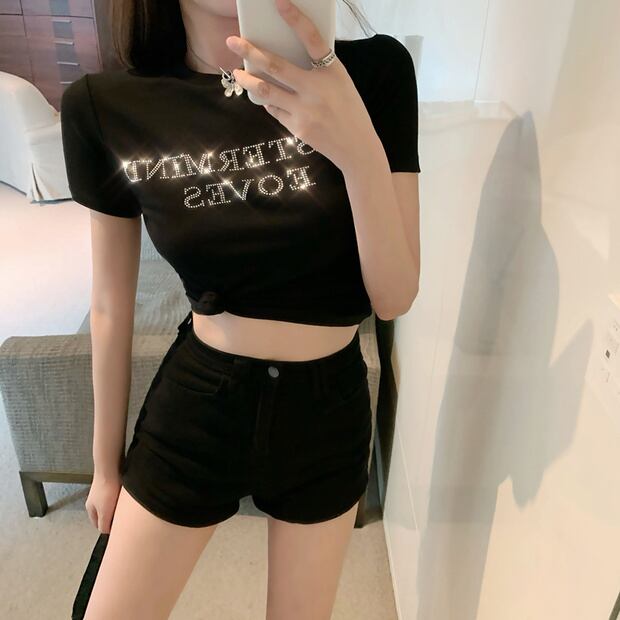 ラインストーンショート半袖スリーブトップス サマースリムブラックTシャツ レディース ハーフスリーブ 夏物 ナナファッション80025917670