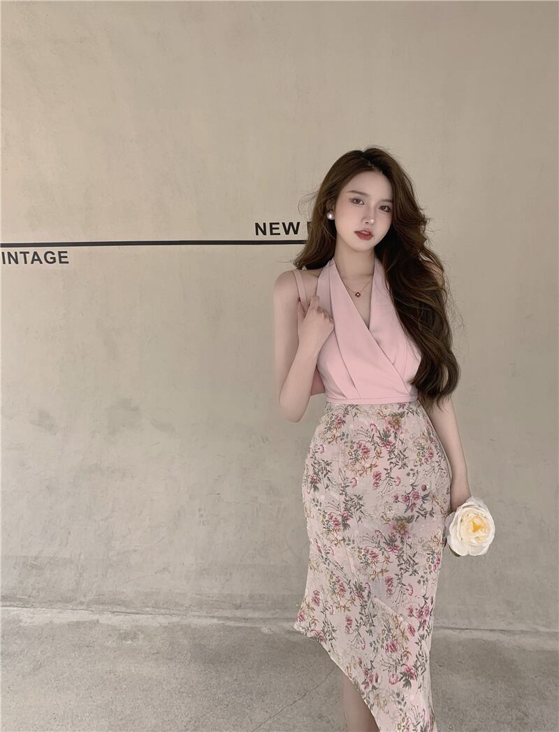 色:ホルタートップ,フローラルスカート