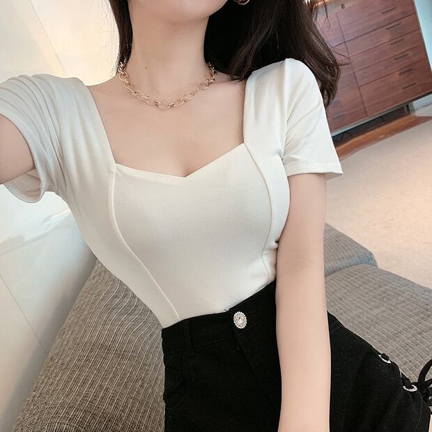 Tシャツ ショートサマースリム薄手ホワイトハイウェストウェストトップス 夏物 スクウェア ナナファッション83570452777