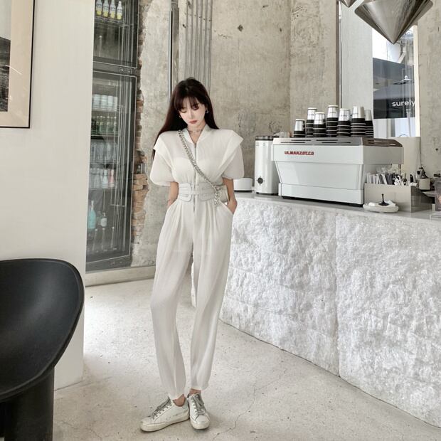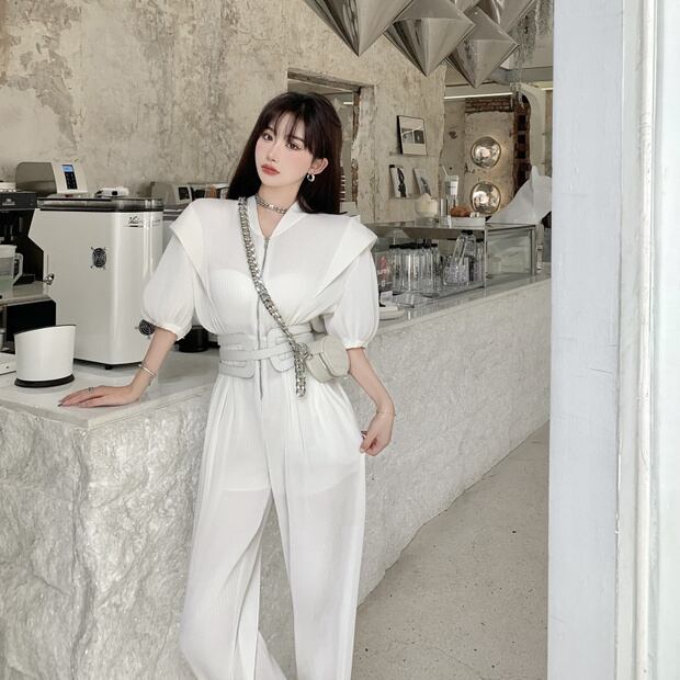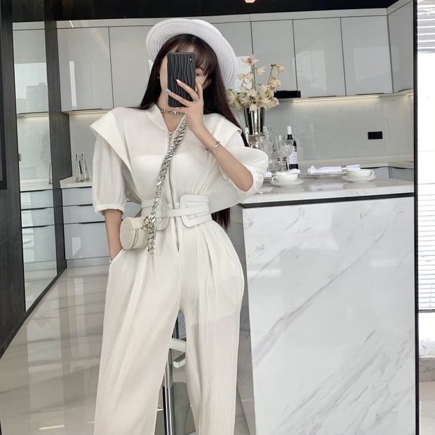 スタイルシフォンプリーツVネックジッパー薄手ハイウェストウェストジャンプスーツ オールインワン サマー 大人ガーリー スウィート キュート カジュアル 夏物 ナナファッション19394084407