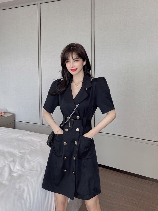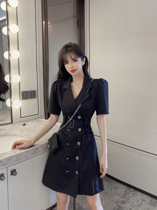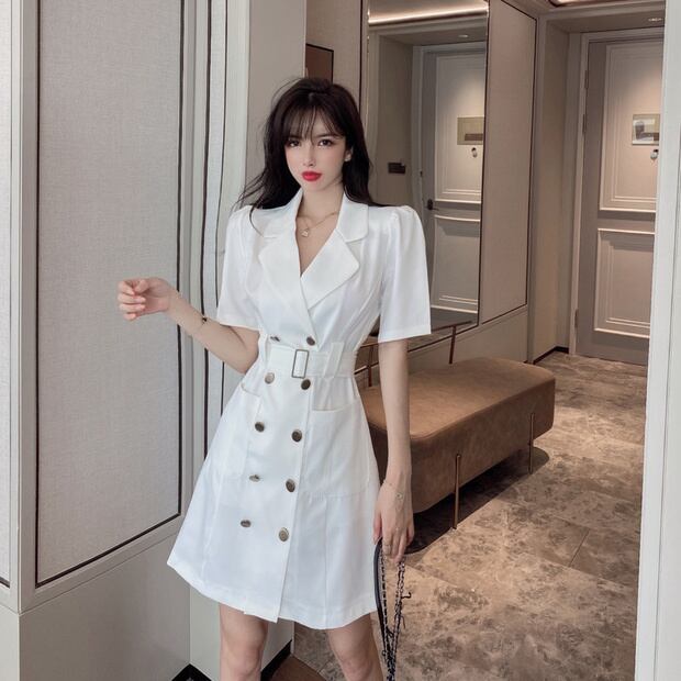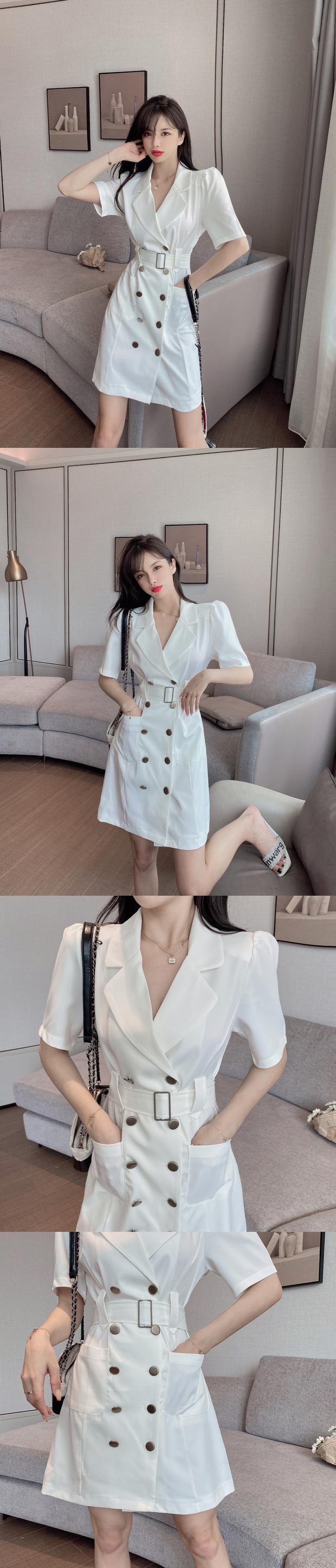 サマーダブルブレストドレス ハイウェストウェスト薄手スタイルスタンダードショートスカート レトロ 夏物 ナナファッション20049453477