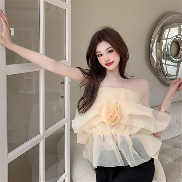 メッシュFlowerデザイン トップス ブラウス サマーシャツ 大人ガーリー スウィート キュート カジュアル 夏物 オフショルダー フラワーデザイン ナナファッション77282581189