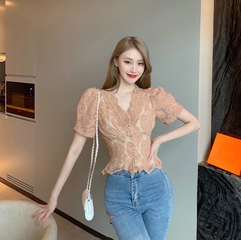 レースシャツ レディーススリーブスタイルスタンダードブラウス サマー レトロ 夏物 Vネック ナナファッション2048535091