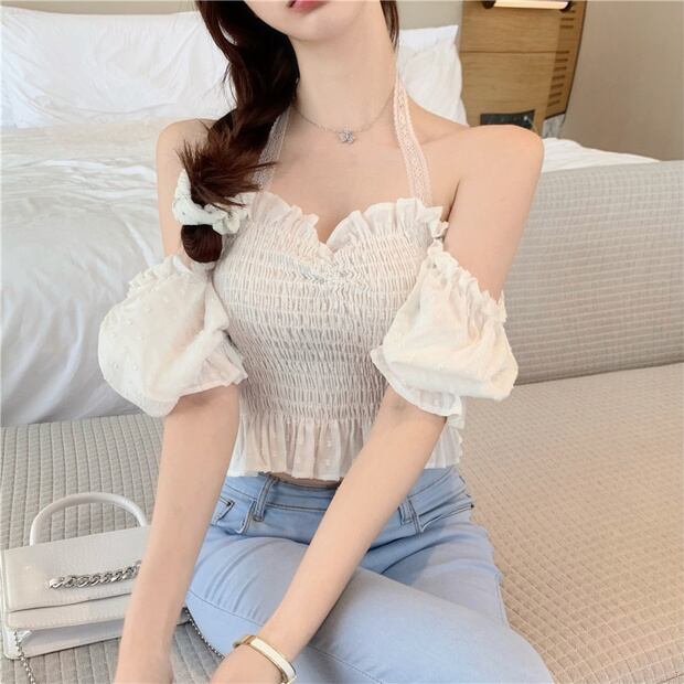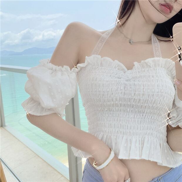 シャツ サマースリーブレースホルター半袖ホワイトトップス ショート ハーフスリーブ 夏物 ナナファッション23860909632