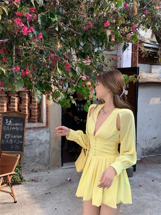 スタイルVネックハイウェストウェスト薄手ドレス サマーAラインショートスカート ロング 夏物 ナナファッション81305327231