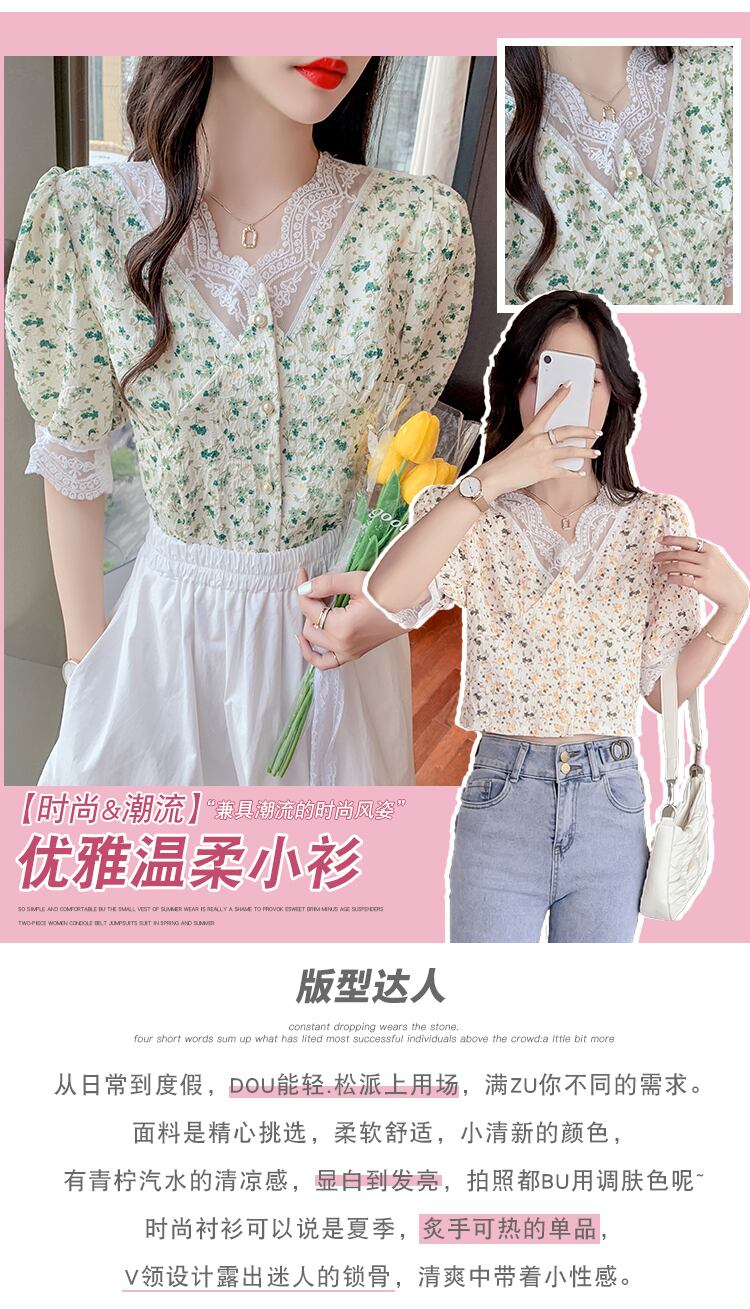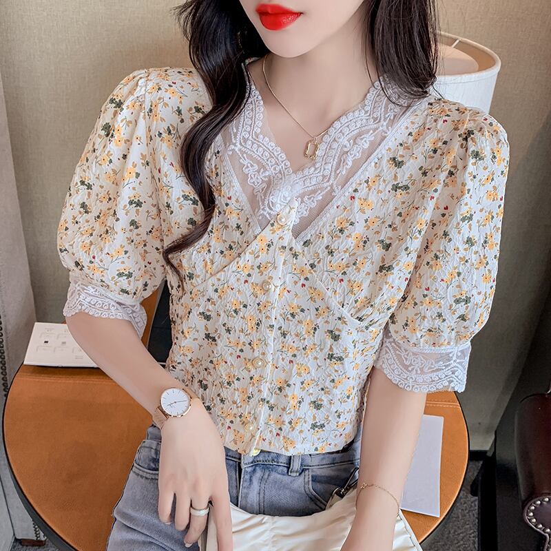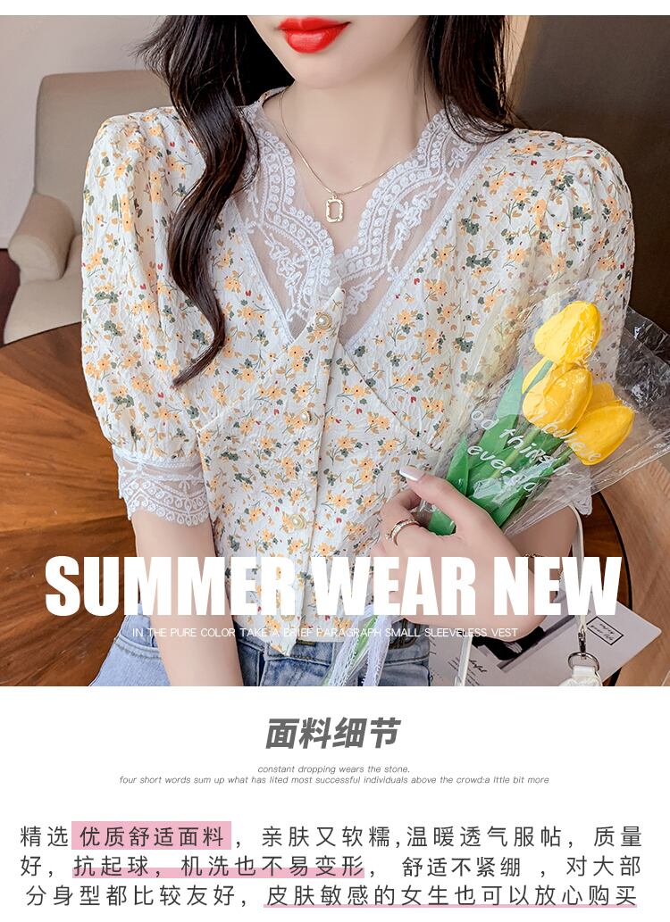 シフォントップス サマーレースフローラルシャツ ショート 夏物 花柄 ステッチ ナナファッション53642907316