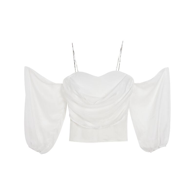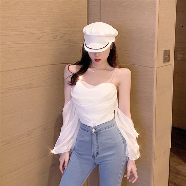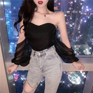 ストラップレススリーブシフォンシャツ サマーブラウス ランタンスリーブ 大人ガーリー スウィート キュート カジュアル 夏物 ナナファッション1333039282