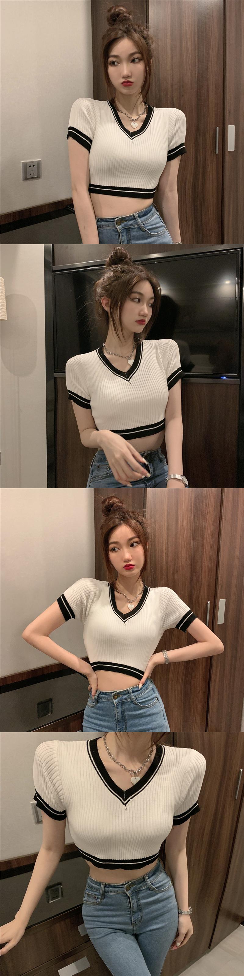 ショートトップス サマースリム薄手VネックハイウェストウェストニットTシャツ 夏物 ナナファッション23021369637