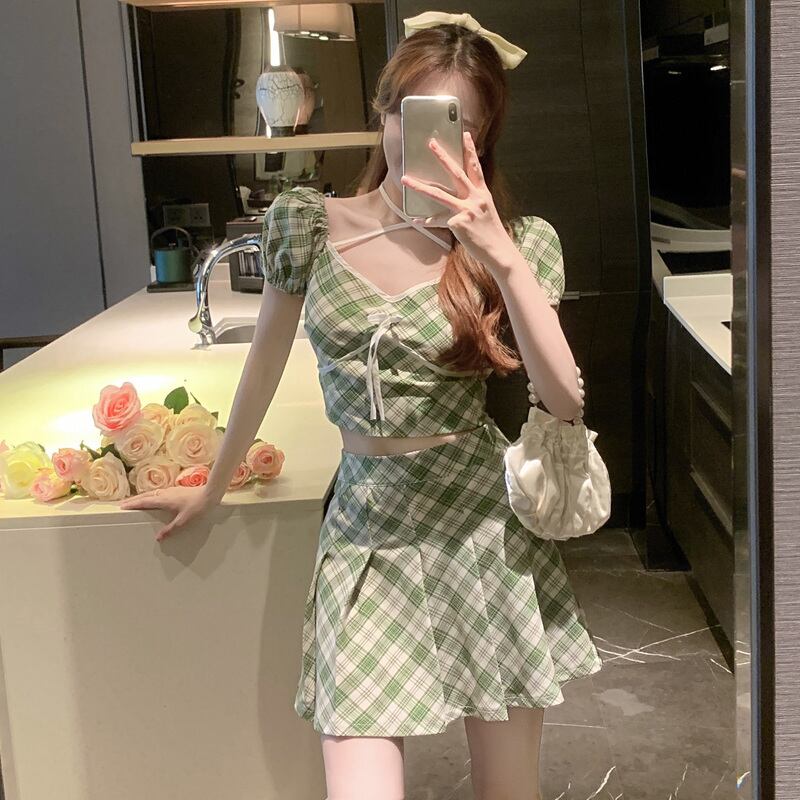 ショート格子柄Tシャツ シャツ トップス ハイウェストウェストスカート 大人ガーリー スウィート キュート カジュアル ナナファッション16251422426
