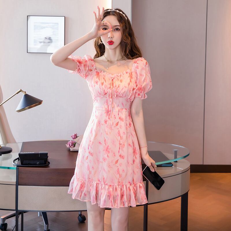 カラーショートウェストスカート ドレス レディース 半袖 ハーフスリーブ 大人ガーリー スウィート キュート カジュアル フラワーデザイン スクウェア ナナファッション68860454185