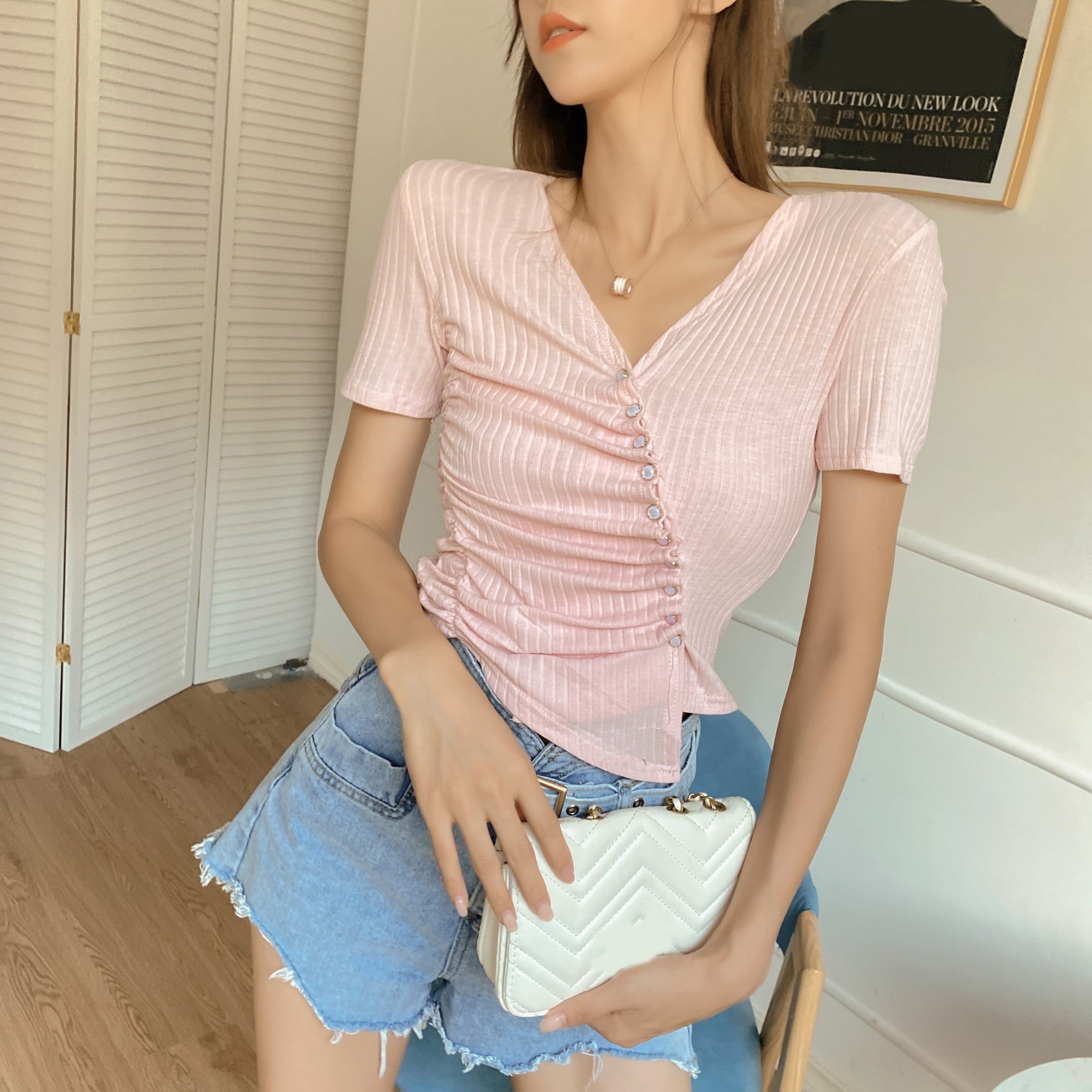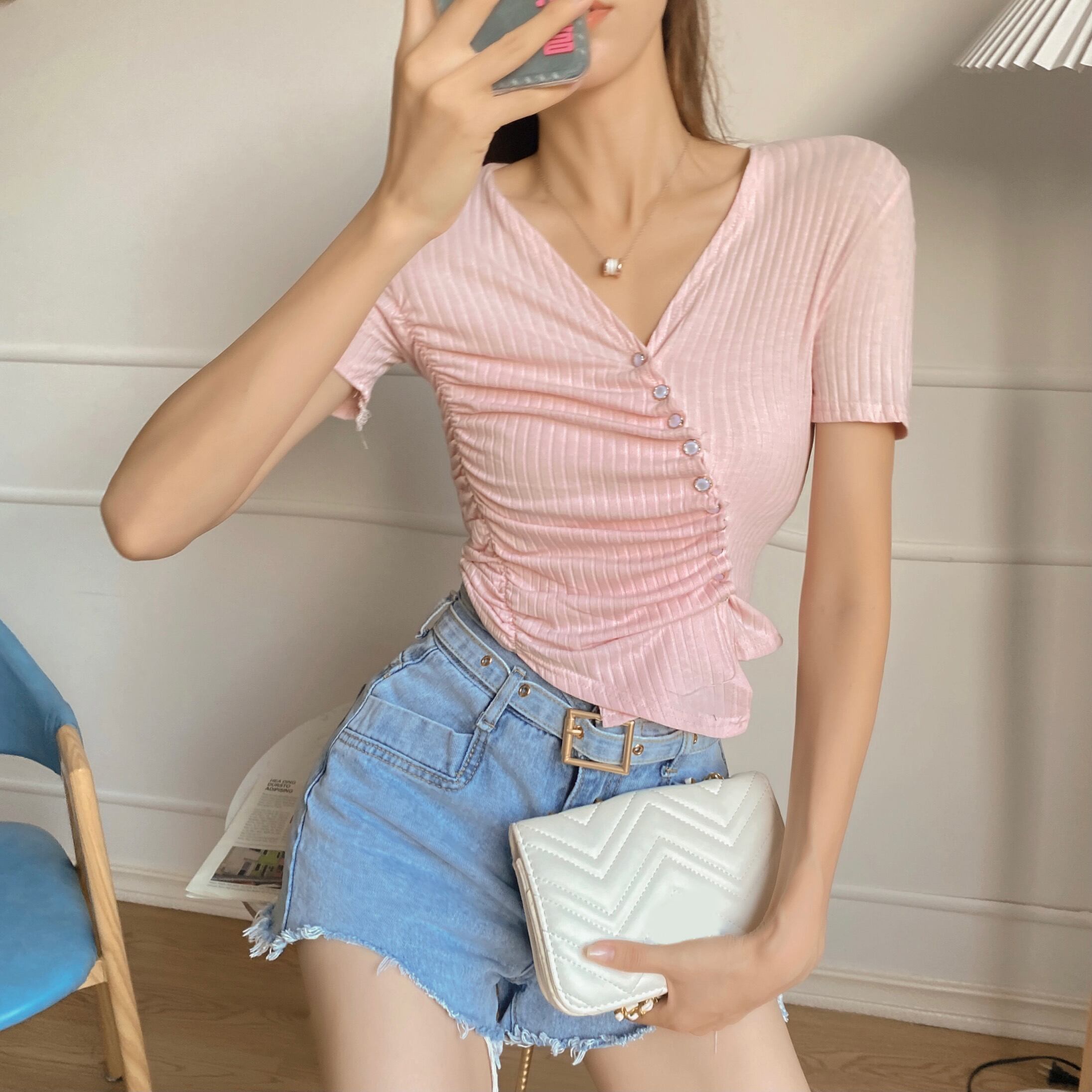 スリットVネックショートTシャツ レディースサマースリムプリーツトップス 夏物 ナナファッション60242118522