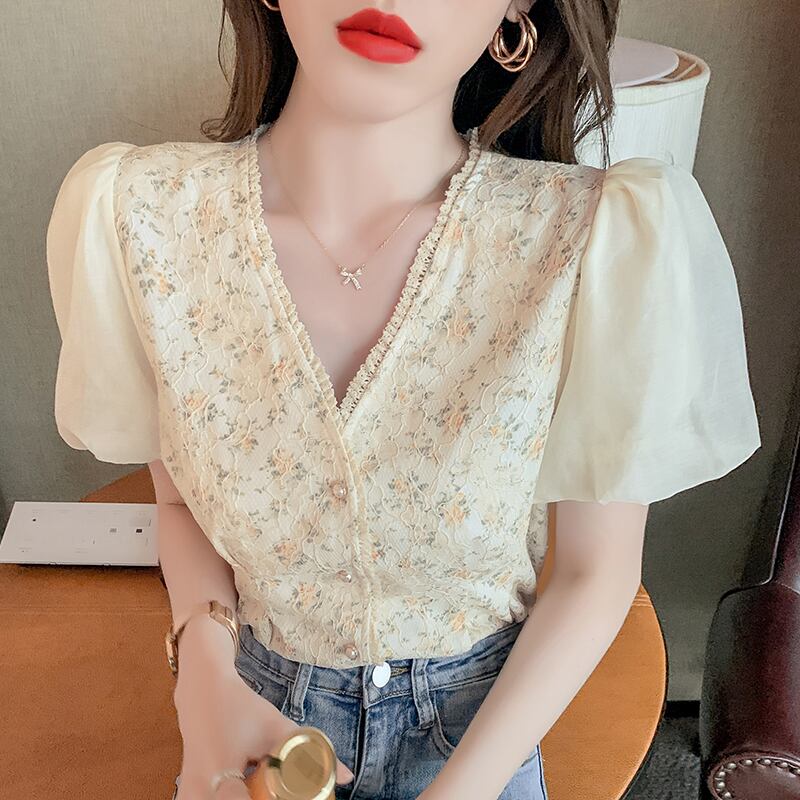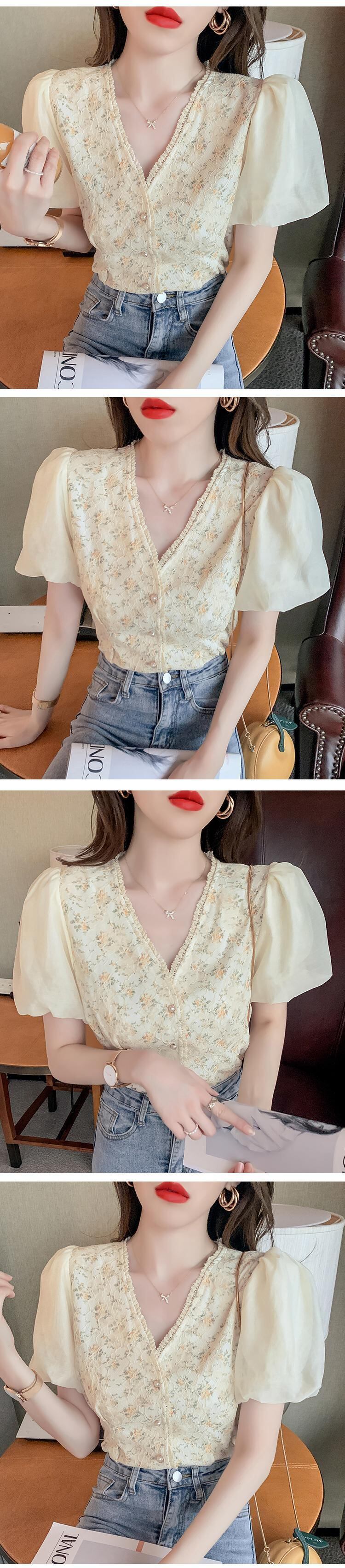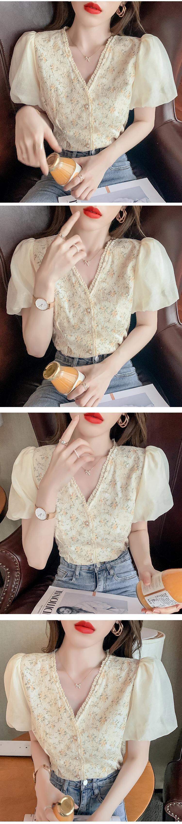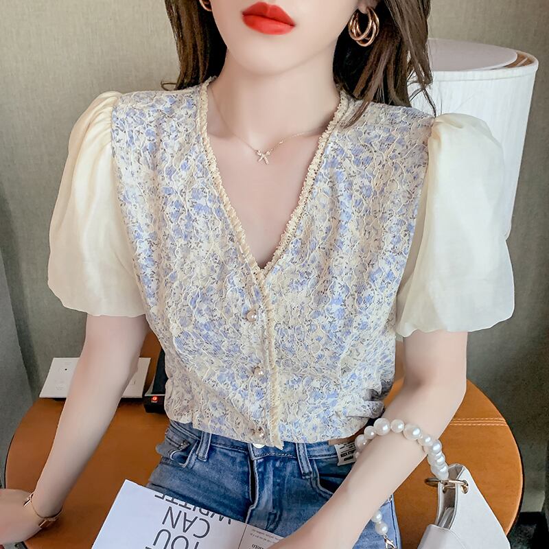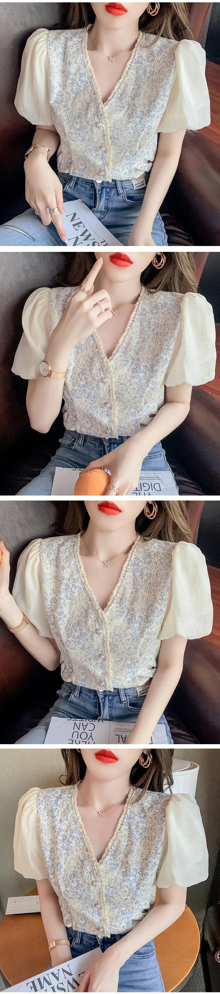 スリーブVネックシャツ サマースタイルレーストップス ランタンスリーブ 夏物 ステッチ ナナファッション24642441554