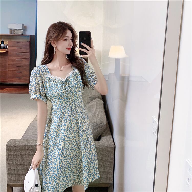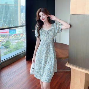 サマースタイルレースウェスト薄手フローラルドレス レディース 夏物 花柄 レースアップ スクウェア ステッチ ナナファッション23953136982