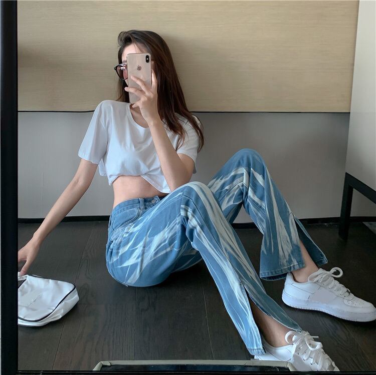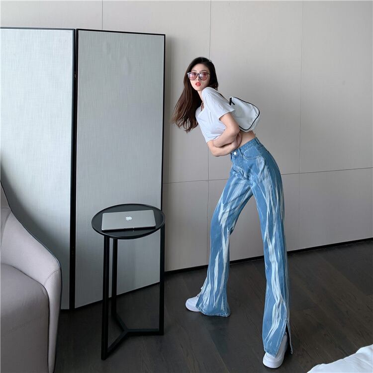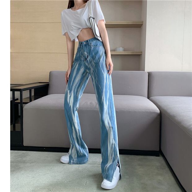 ジーンズ サマーハイウェストスタンダードロングパンツ レッド レトロ 夏物 ナナファッション45501356568