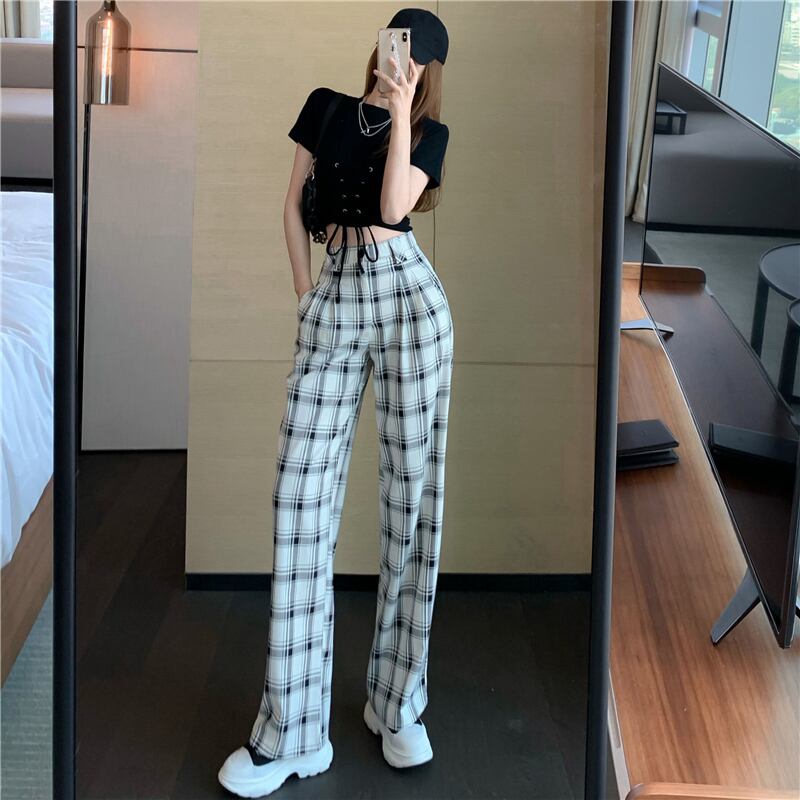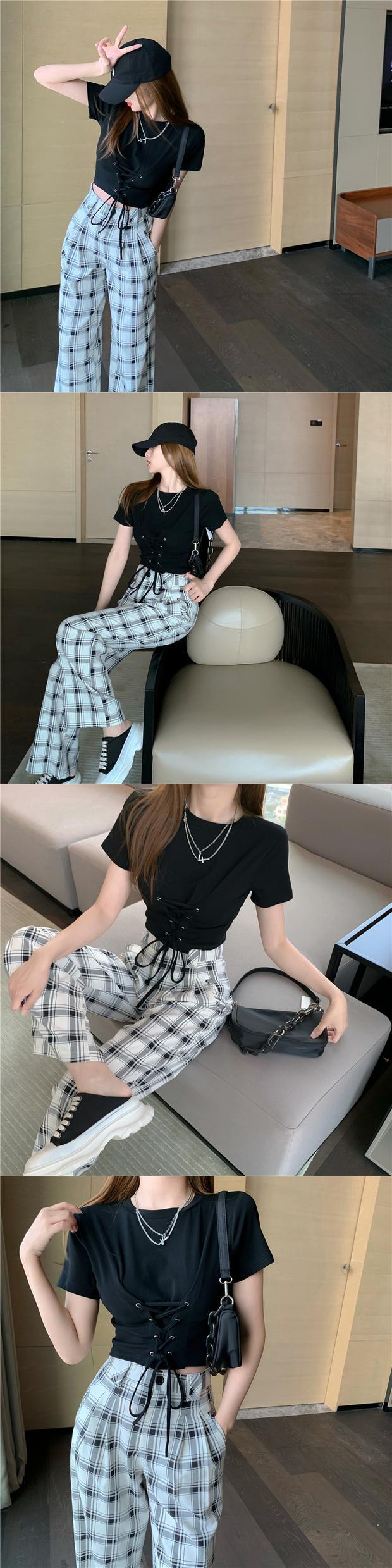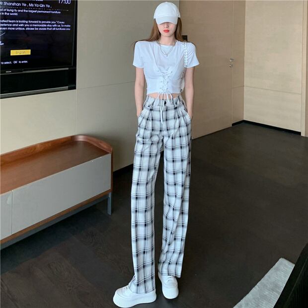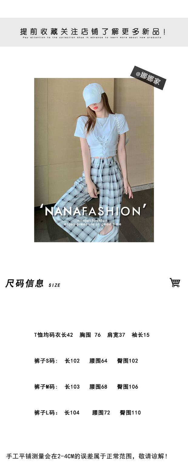 サマーTシャツ トップス ハイウェストウェスト格子柄ワイドレッグパンツ ストリート 夏物 ワイドパンツ ナナファッション44617117