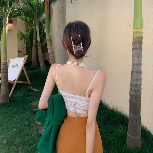 色:緑のスーツ,レースキャミソール,黄色のスカート