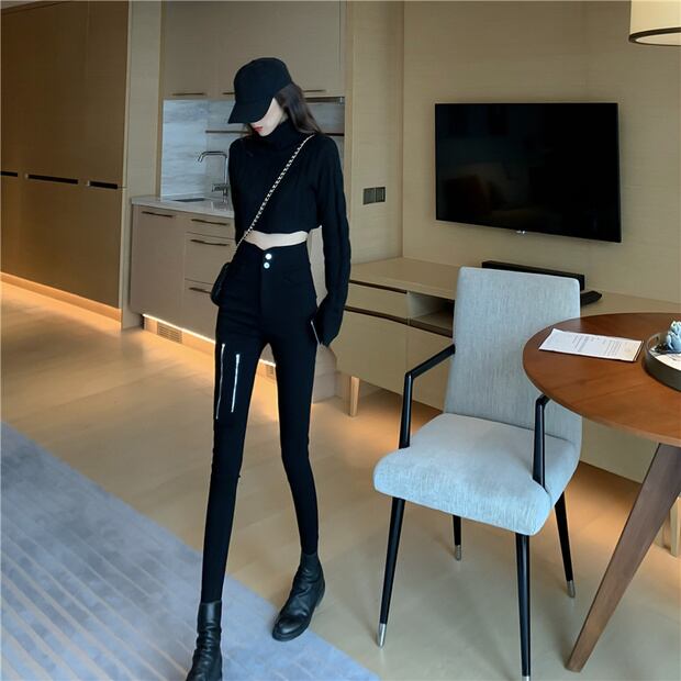 スプリングハイウェストウェストスリムブラックパンツ 春物 ナナファッション66698986673