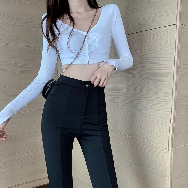 サマースタイルスリムカジュアルパンツ ハイウェストブラックロング レッド 夏物 ナナファッション59649001197