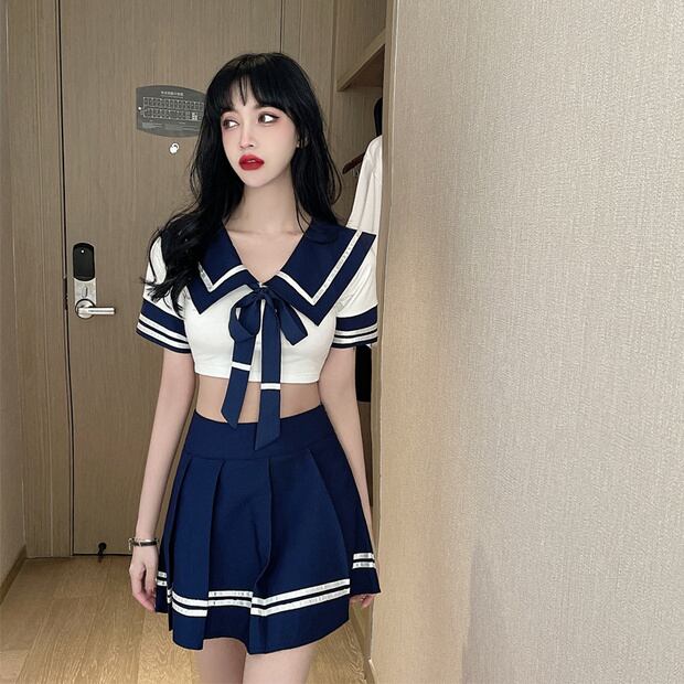 スタイルスプリングサマーネイビーショートトップス プリーツスカート 春物 夏物 ナナファッション89631833222