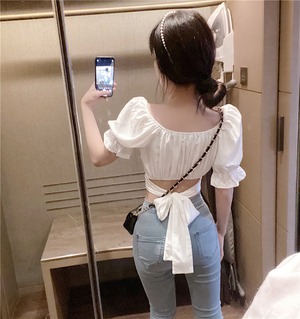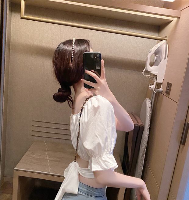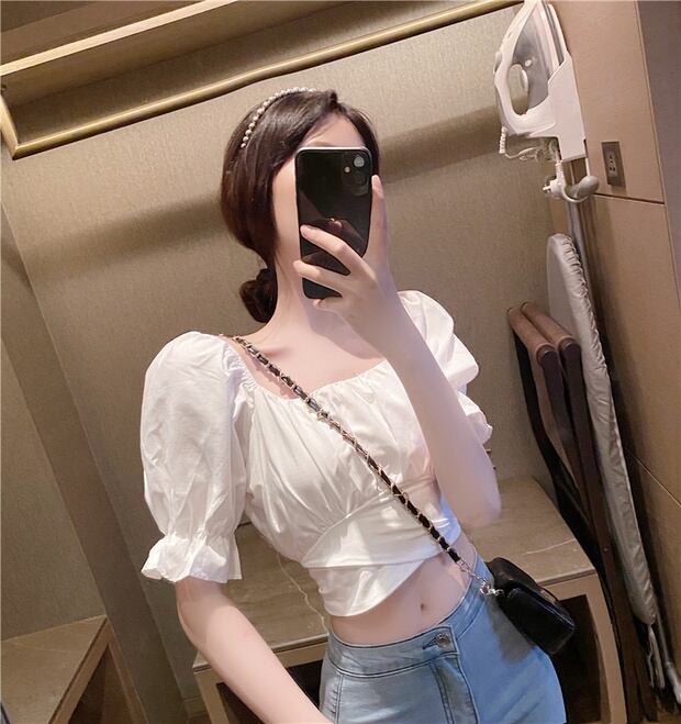 サマースタイルスリーブハイウェストウェストショートホワイトシャツ トップス 夏物 スクウェア ナナファッション13493600782