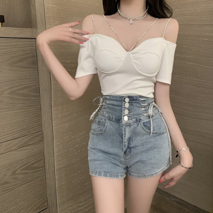 色:白のシャツ,ブラックトップ,ブルーデニムショーツ