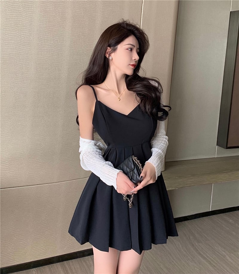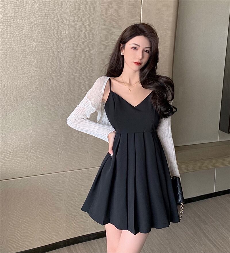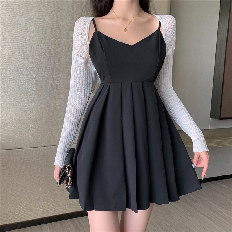 スタイルウェストプリーツブラックドレス ホワイトニットジャケット サマー 大人ガーリー スウィート キュート カジュアル 夏物 ナナファッション2507547006