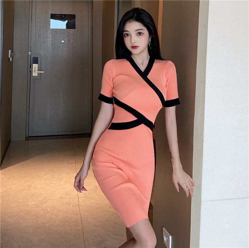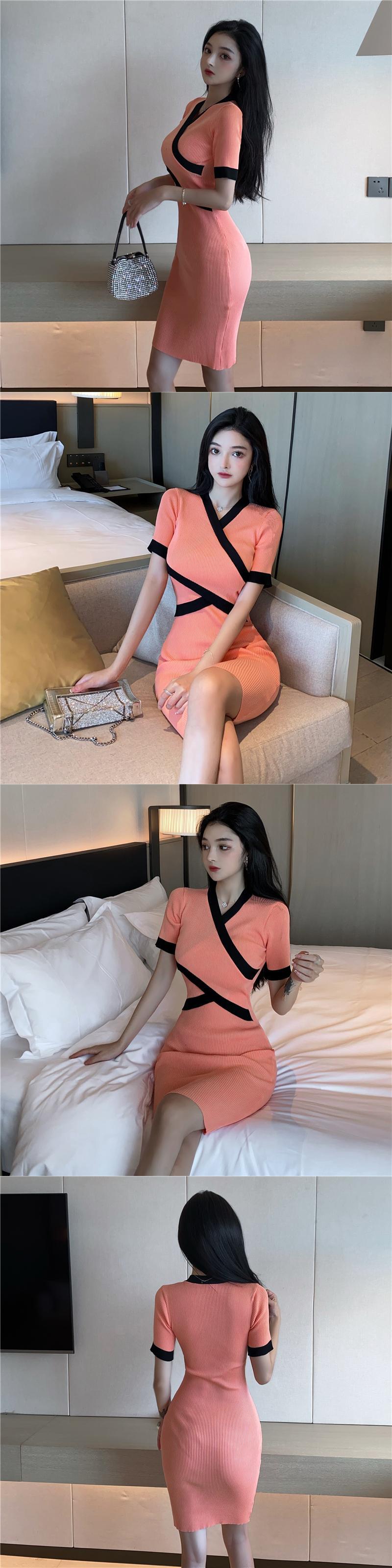 サマースタイルVネックカラーウェストニットドレス 夏物 ナナファッション64022980295