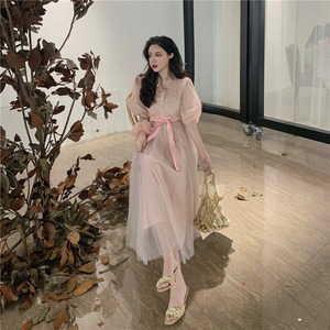 レッドスタイルスプリングサマースリーブシャツ ハイウェストウェストメッシュスカート ピンク ランタンスリーブ 春物 夏物 ナナファッション71261641043