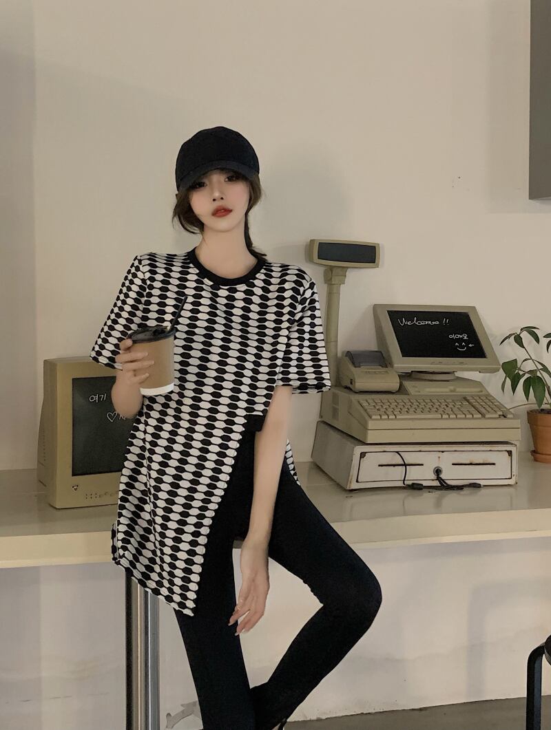ブラックホワイト格子柄Tシャツ ハイウェストカジュアル レッド ストリート ナナファッション45086401638