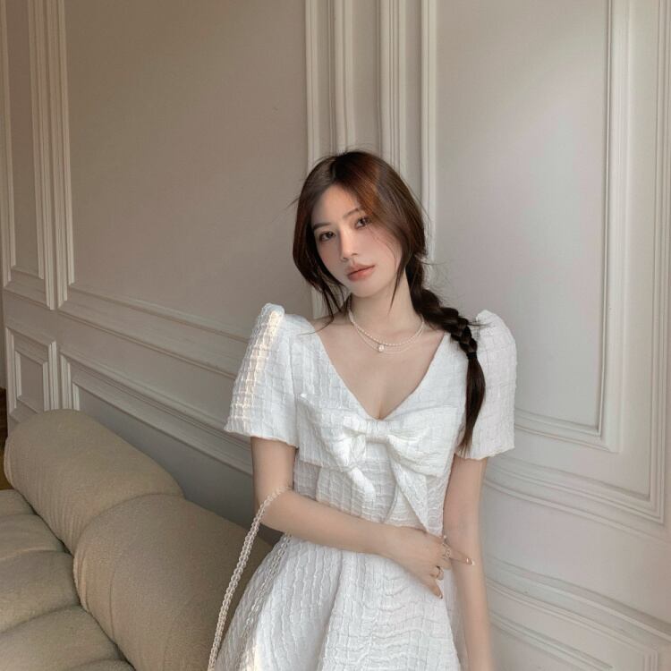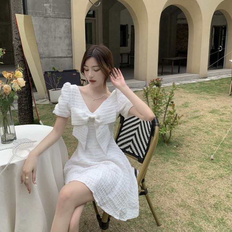スカート サマーVネックリボンドレス ブローチ 大人ガーリー スウィート キュート カジュアル 夏物 ナナファッション77961949841