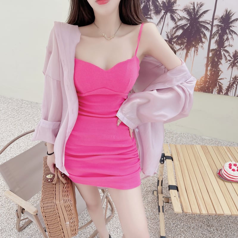 色:ピンクのシャツ,青いシャツ,ピンクのサスペンダードレス,青い服