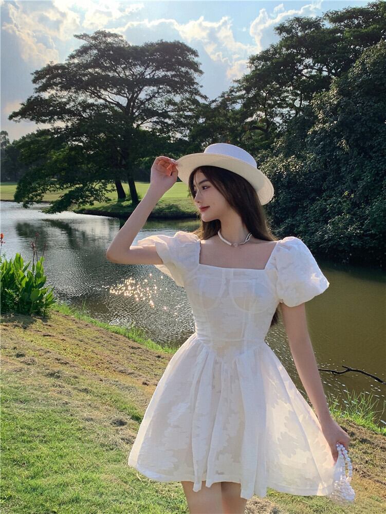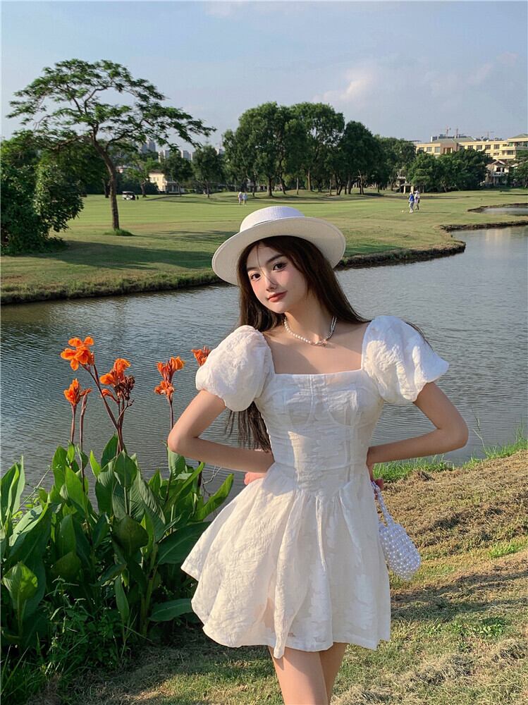 スタイルサマーホワイトスカート ウェストスリーブドレス レース 大人ガーリー スウィート キュート カジュアル ふわふわ 夏物 ナナファッション87876686469