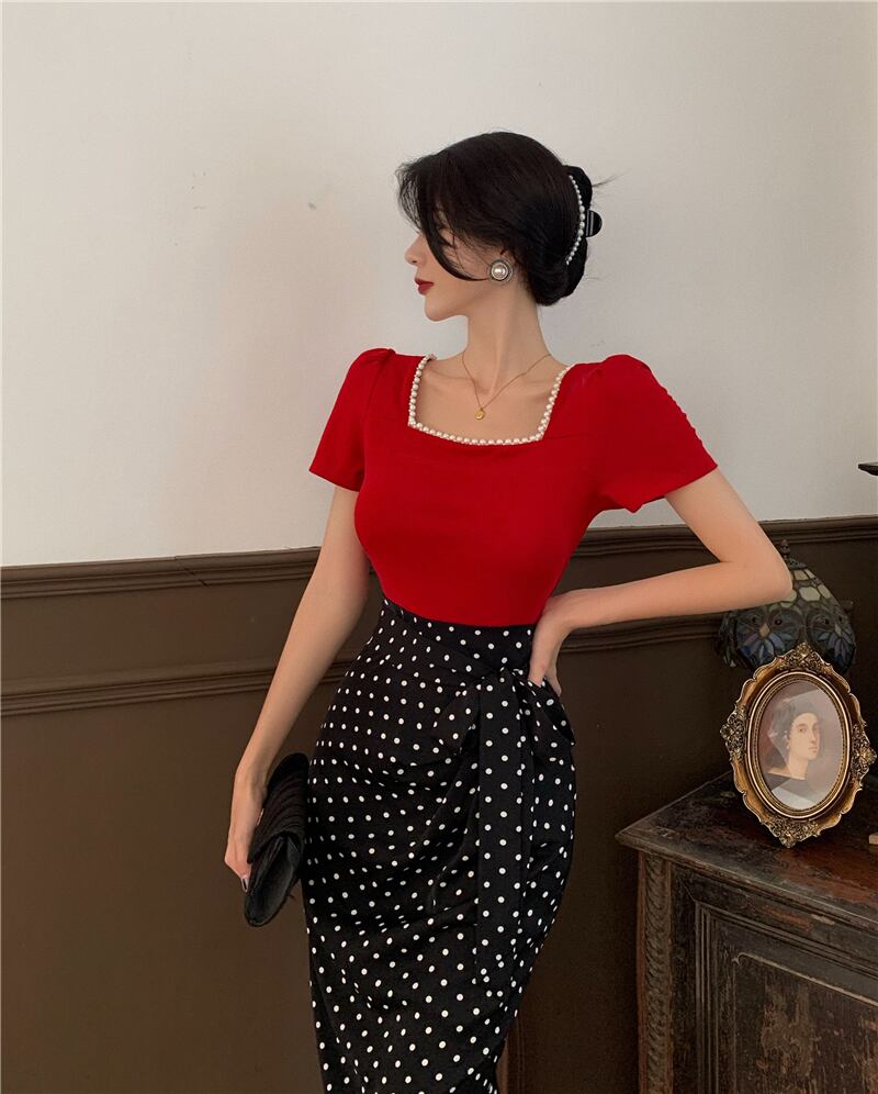 ショートスリーブTシャツ カラートップス レース水玉スカート レッドスタイル 半袖 ハーフスリーブ スクウェア ナナファッション73287713957