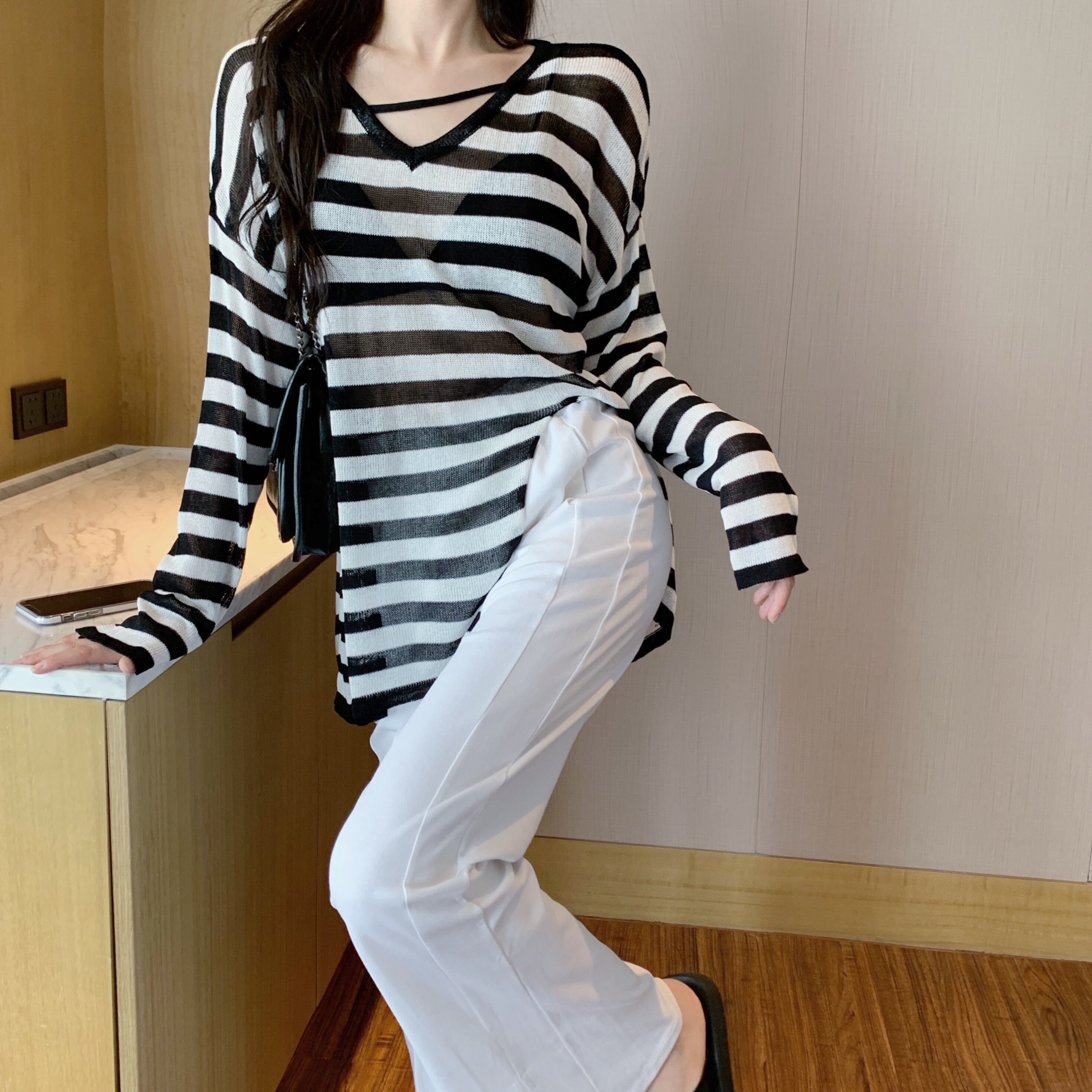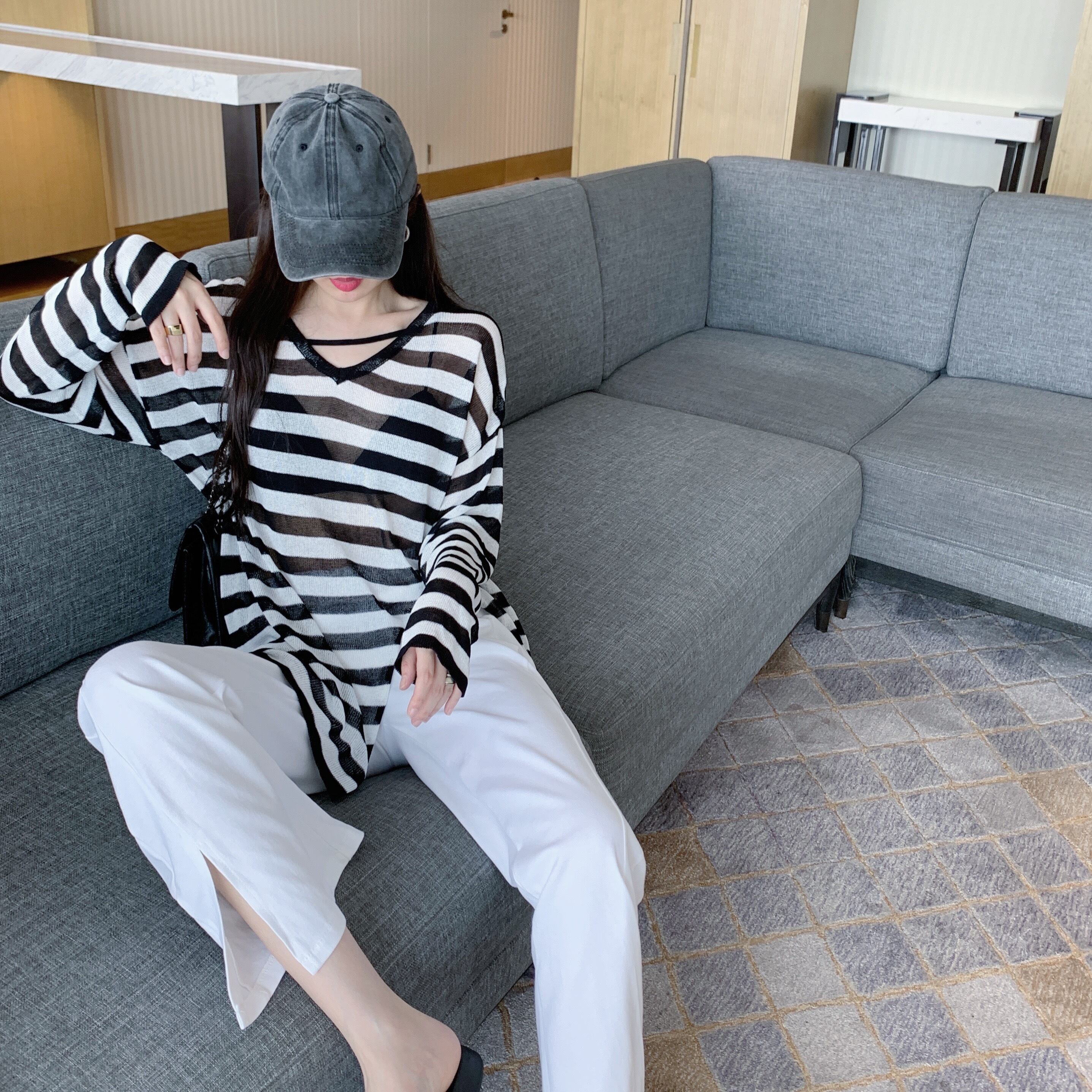 オータムレッドルーズストライプ薄手シャツ カジュアルパンツ 秋物 ナナファッション44619284722