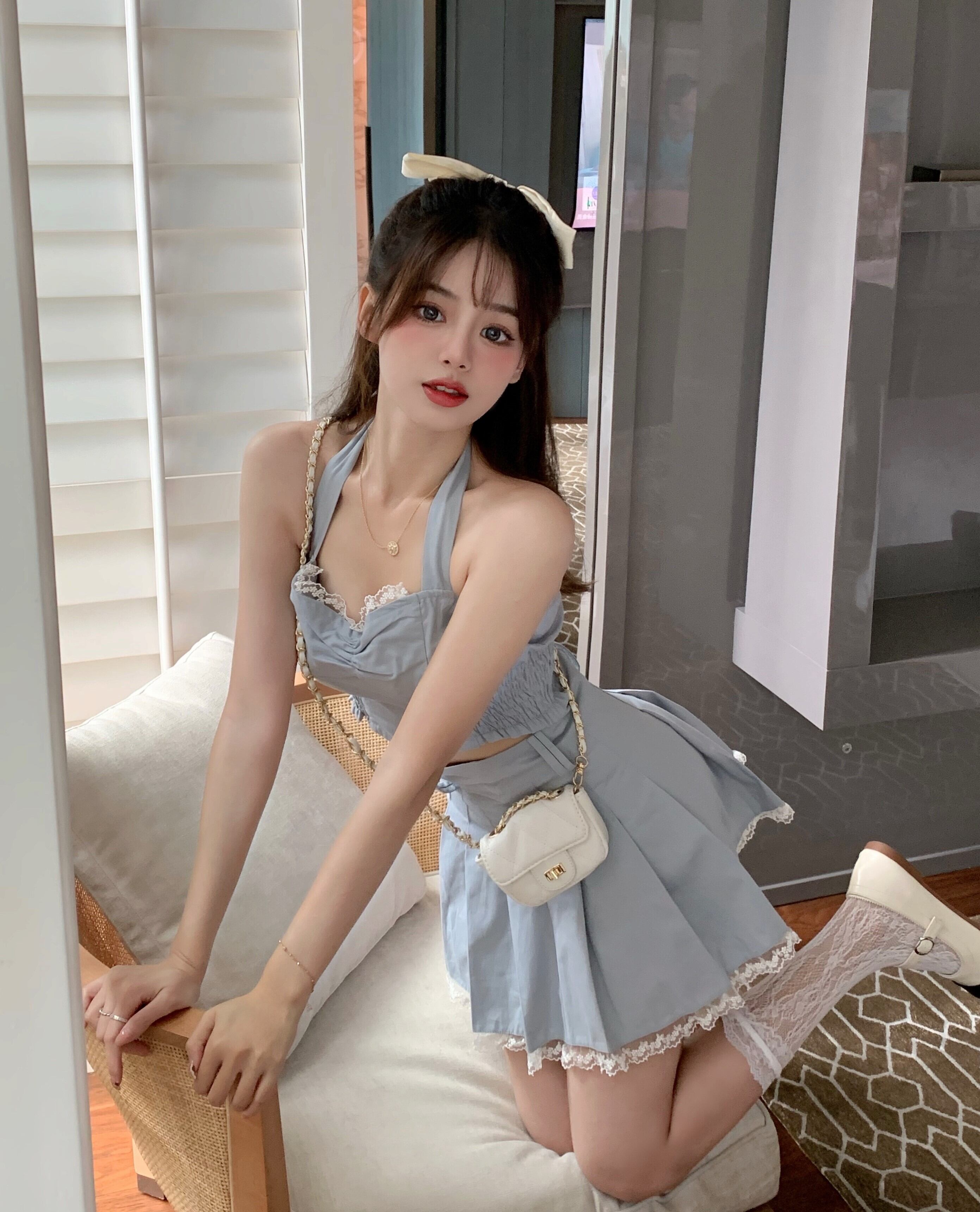 色:ハートウォーターブルーホルターネックトップス,ハートウォーターブルーのスカート,白い日焼け止め