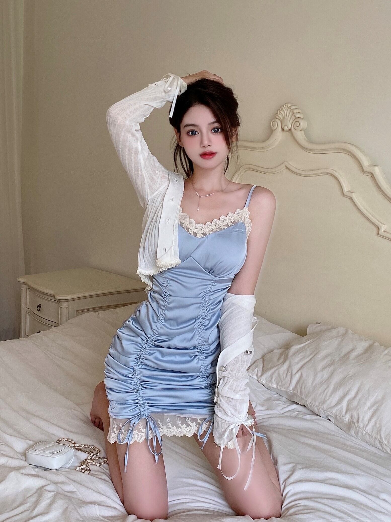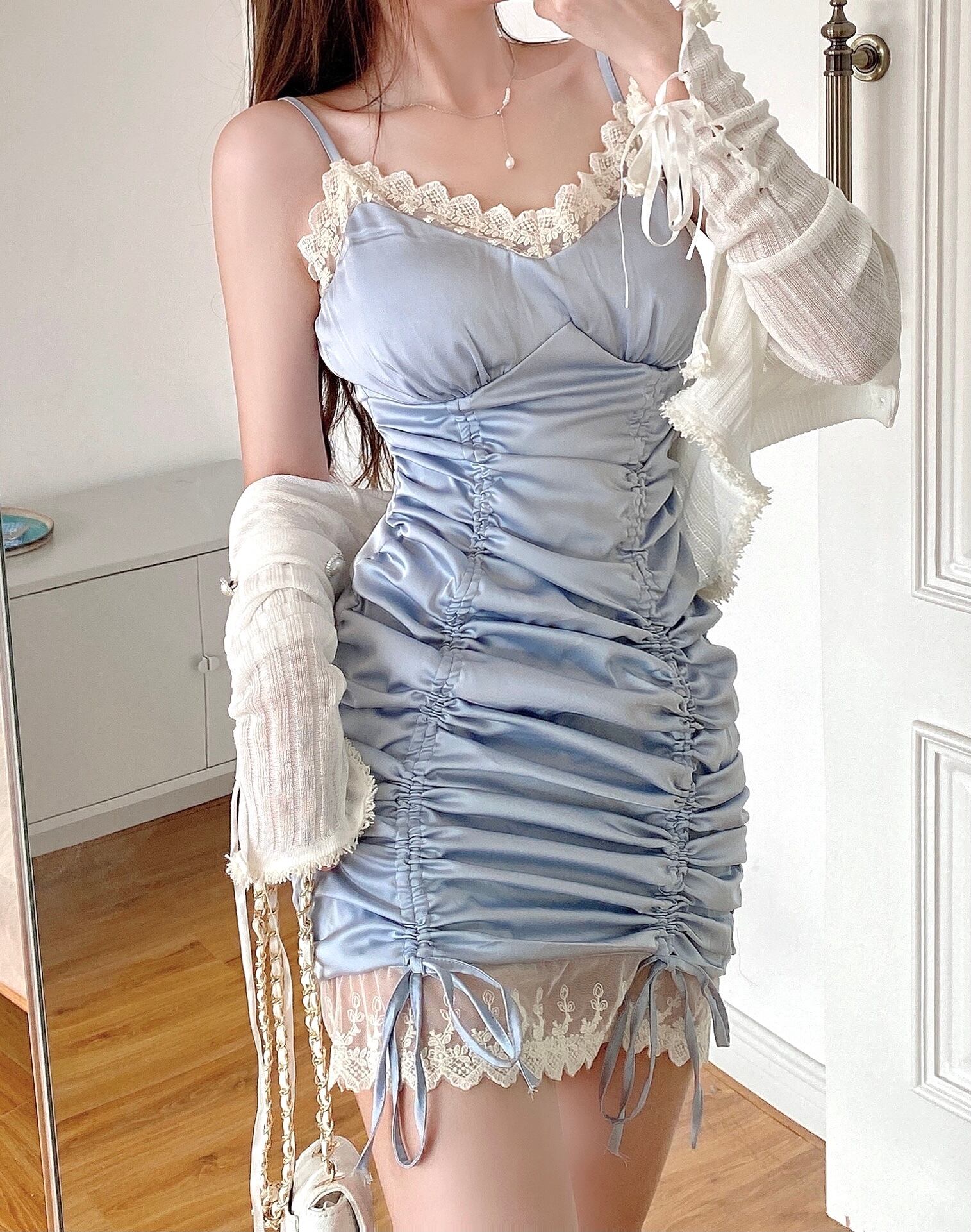 色:白い日焼け止めトップ,ライトブルーのサスペンダースカート
