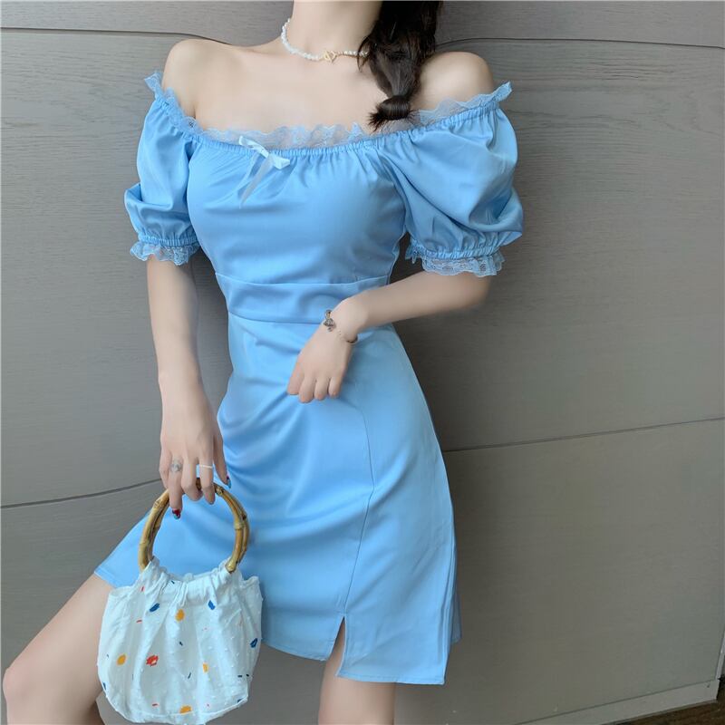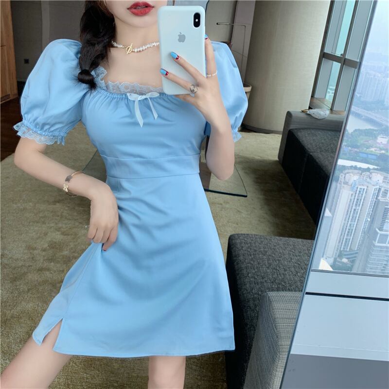 サマースタイルレーススリーブブルーリボン薄手ドレス レディース 夏物 スクウェア ナナファッション73177522151