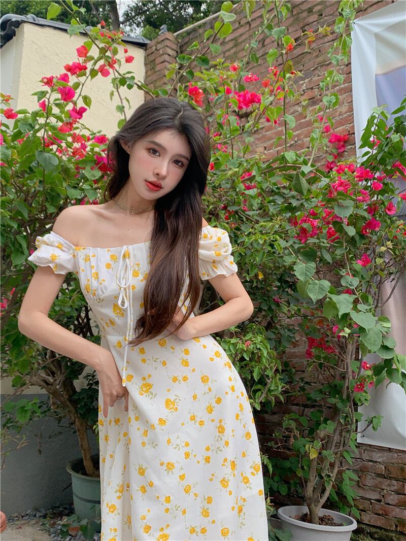 スタンダードフローラル薄手ハイウェストウェストスリットドレス サマー レトロ 夏物 花柄 スクウェア ナナファッション35211330233