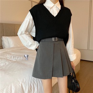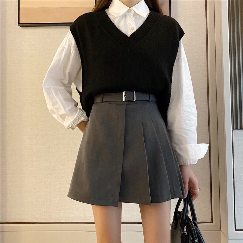 オータムショートスカート ブラックプリーツハイウェストウェストスタイル 秋物 ナナファッション93648057742