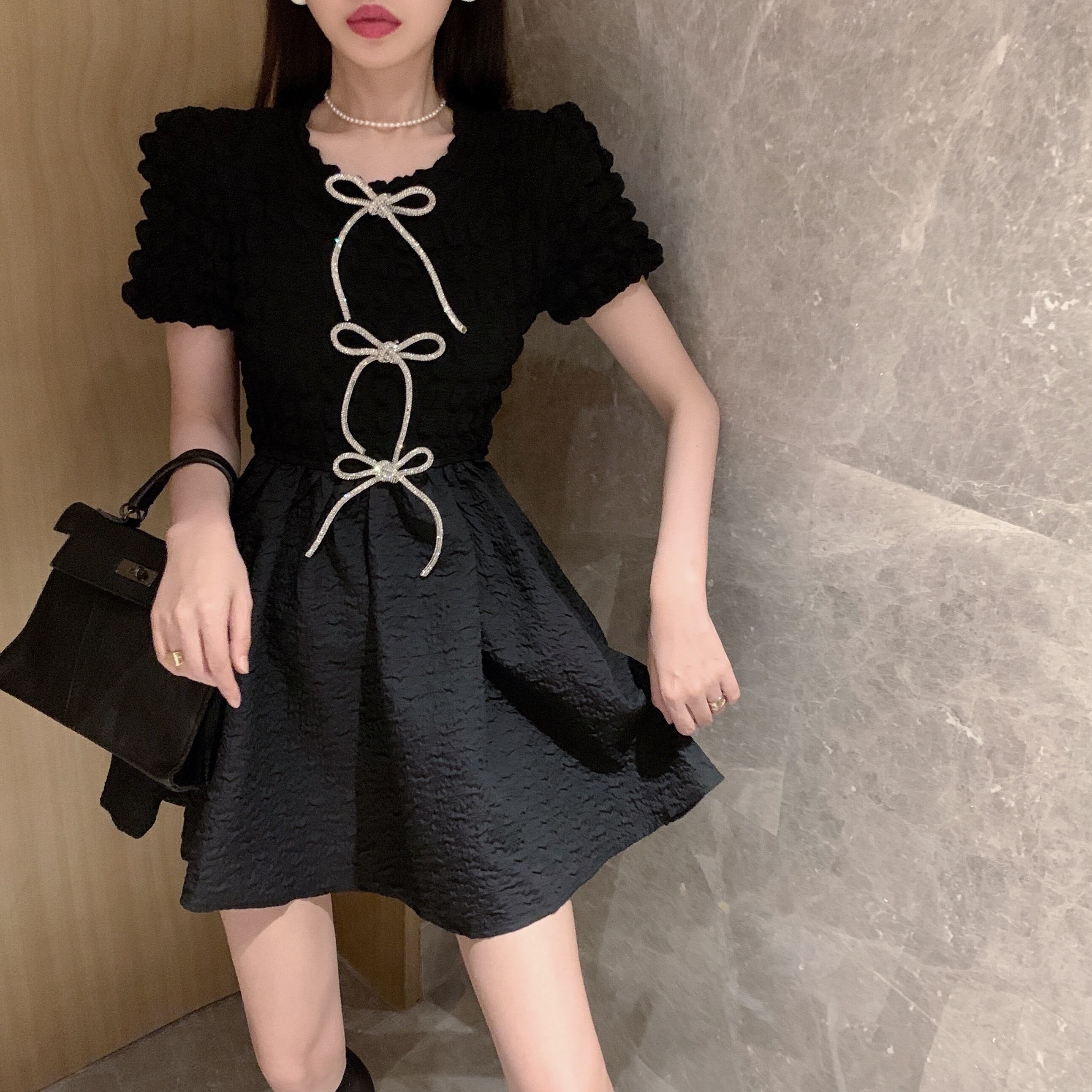 スカート サマーウェストリボンラインストーンブラックドレス レディース 大人ガーリー スウィート キュート カジュアル 夏物 ナナファッション67193784135
