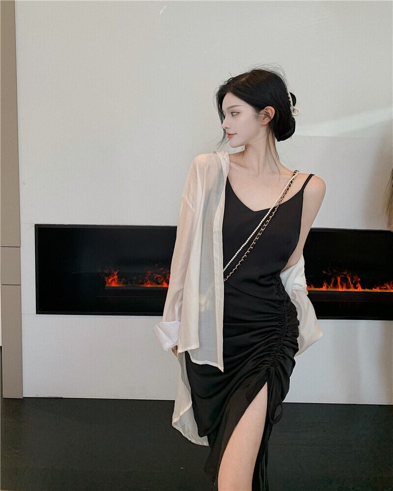 色:カーキ色のシャツ,カーキストラップドレス,白のシャツ,ブラックサスペンダースカート