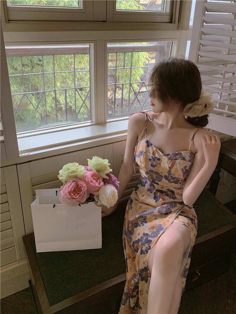 サマードレス スタンダードVネックフローラルシフォンウェストロングスカート レトロ 夏物 花柄 ナナファッション52474223978