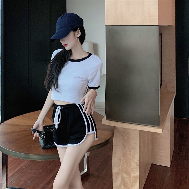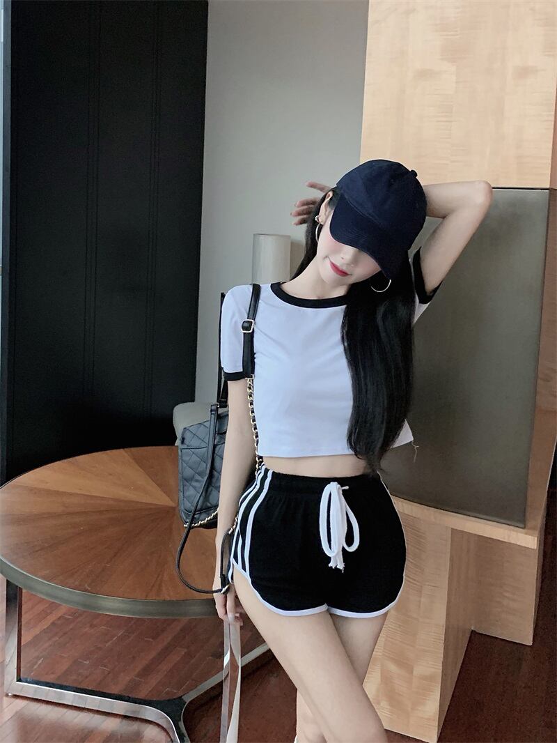 ハイウェストウェストショートクロップドラウンドネックスリムカラーTシャツ ギャザーパンツ Oネック ナナファッション8898551606