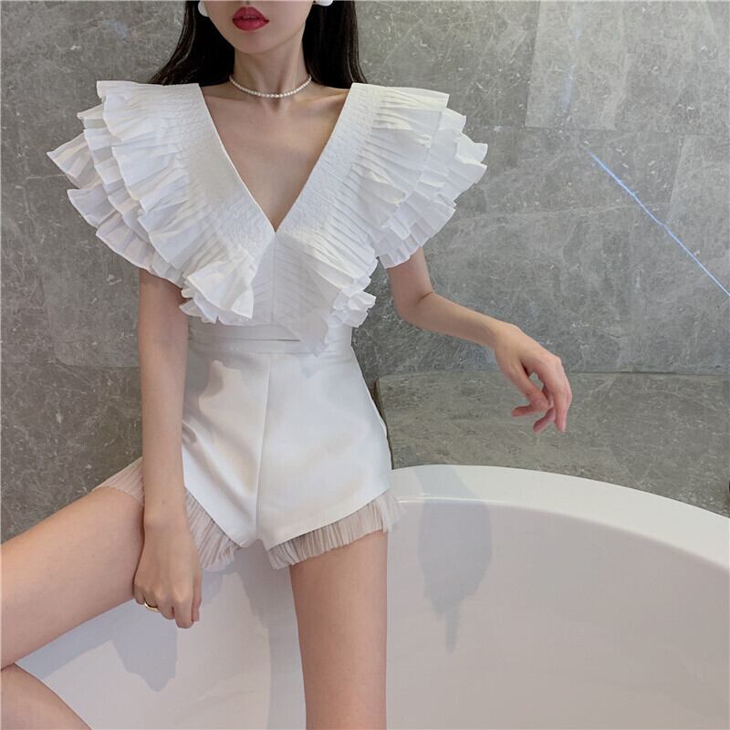 レディースサマーホワイトシャツ ハイウェストウェストワイドレッグショーツ 夏物 ブルマー ワイドパンツ ナナファッション99505711481