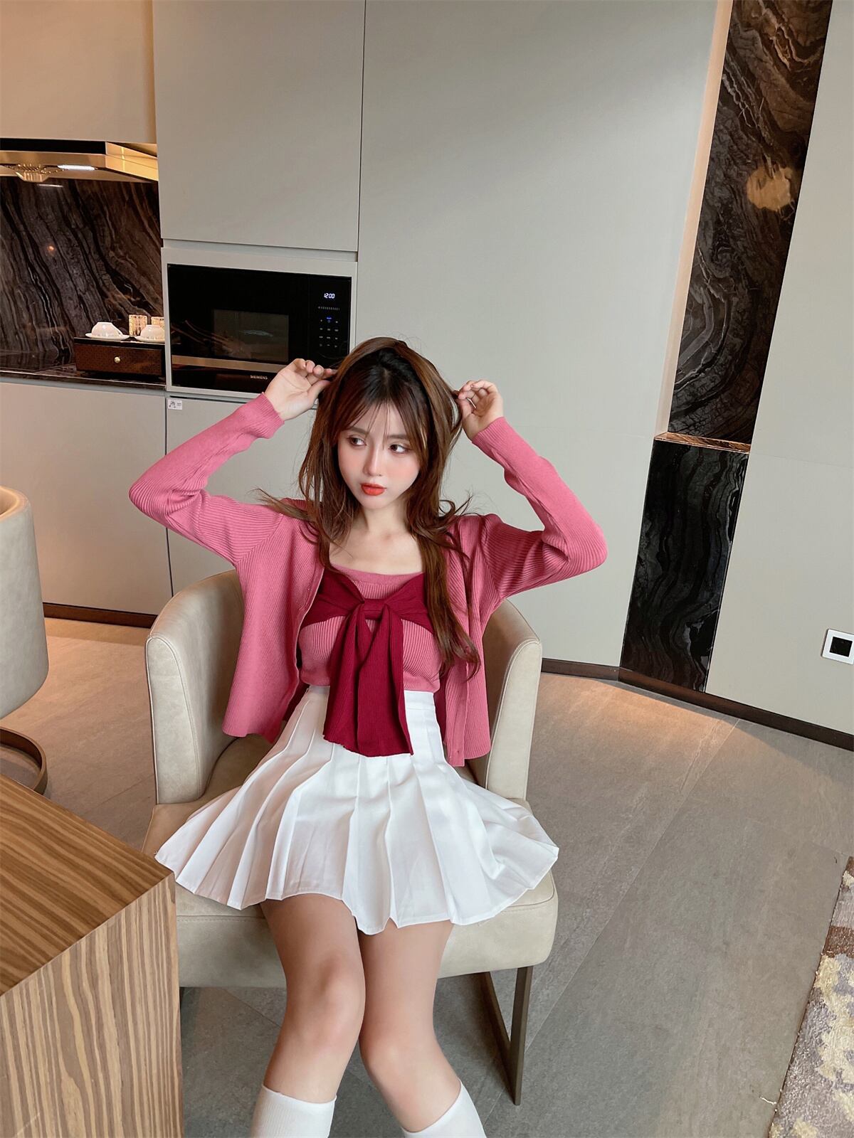 スタイルスタンダードニットカーディガンジャケット プリーツスカート リボン レトロ 大人ガーリー スウィート キュート カジュアル ナナファッション13725848507
