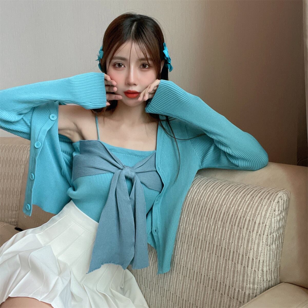 色:ツーピースブルーブラウス,ツーピース粉体塗装,白いプリーツスカート