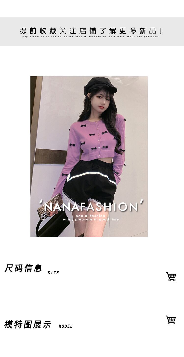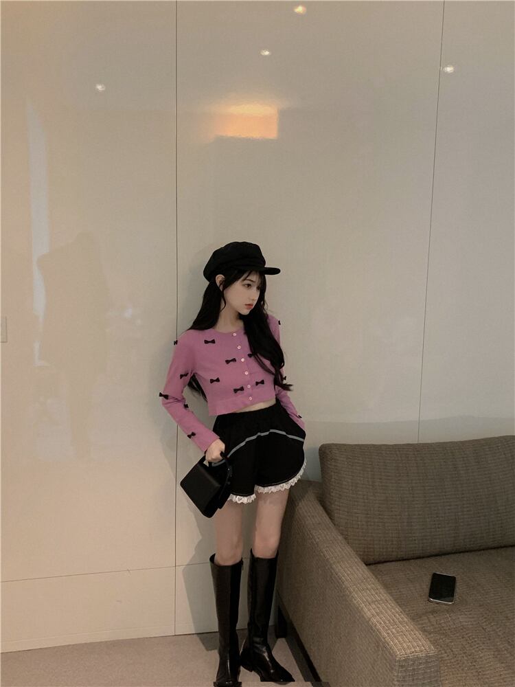 リボンラウンドネックニットカーディガンショートジャケット レースハイウェストショーツ ロング 大人ガーリー スウィート キュート カジュアル ブルマー Oネック ナナファッション49043121369
