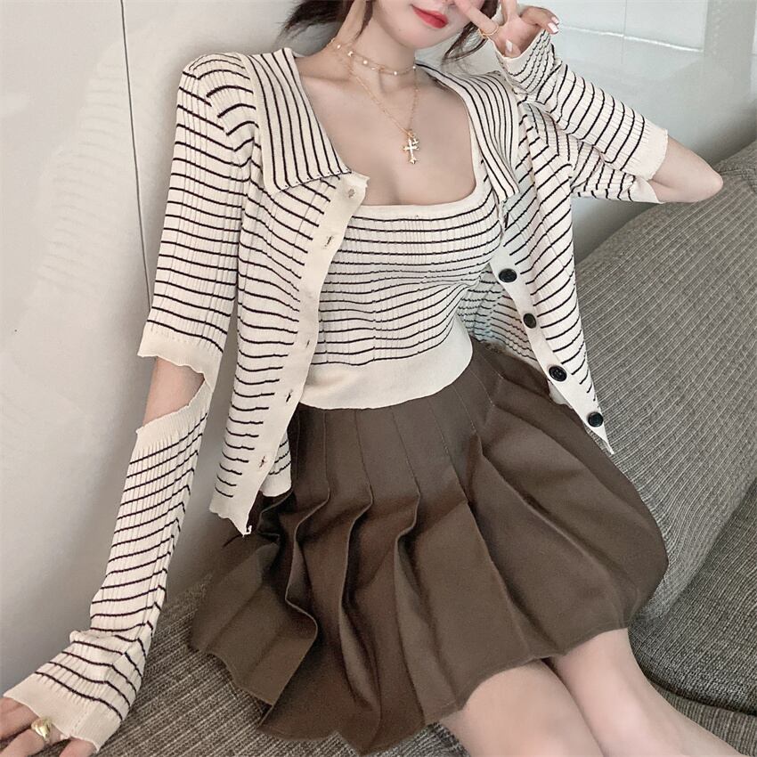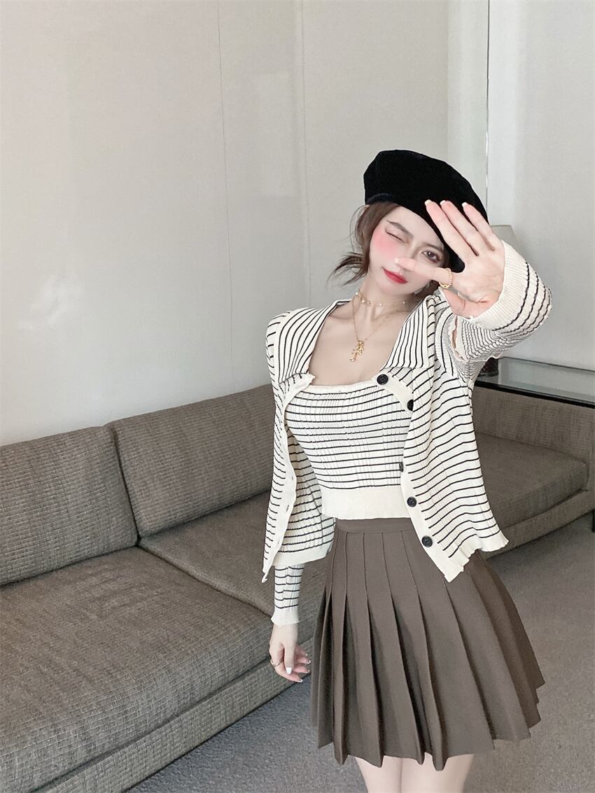ニットカーディガンハイウェストプリーツスカート ロング ピュア ナナファッション95368520628