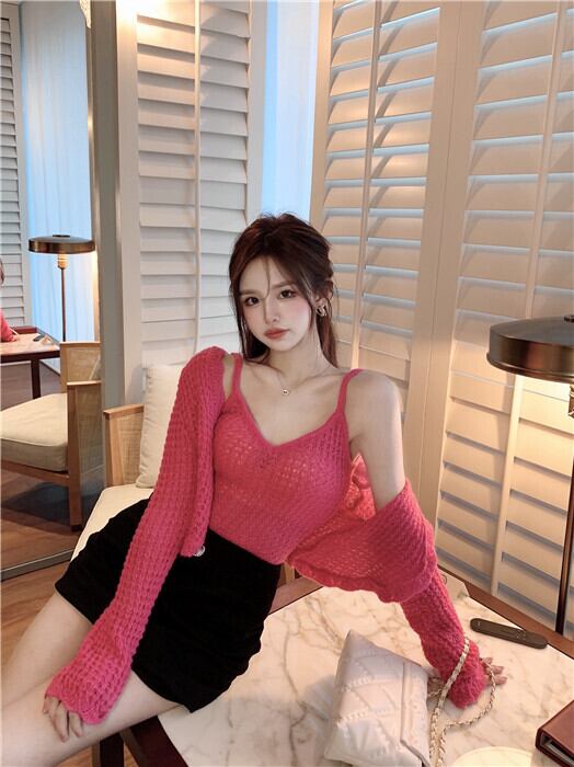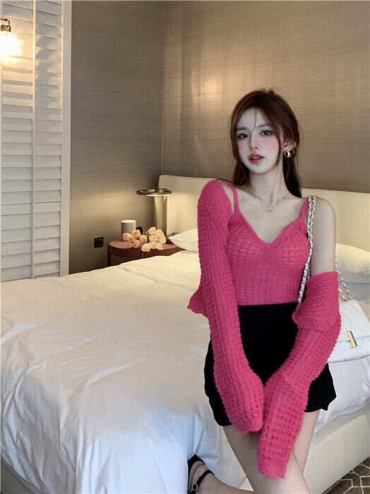 Vネックニットカーディガンジャケット ハイウェストウェストショートトップス オータム ロング ピンク 秋物 ナナファッション23975289336